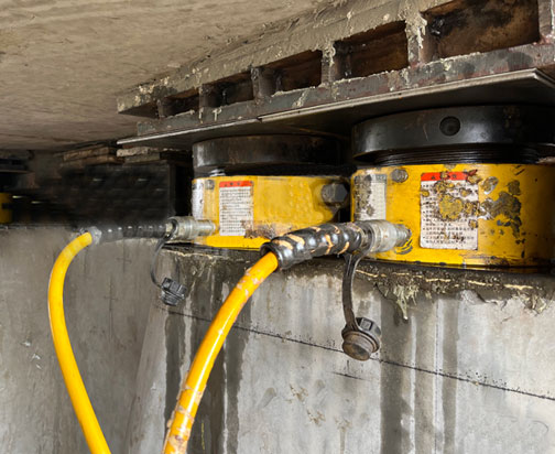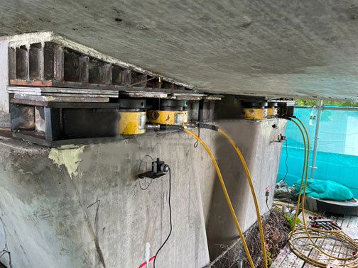 高架匝道同步頂升更換支座,選用32臺 200T-50mm薄型自鎖液壓千斤頂,配套兩套PLC 8點(diǎn)智能控制同步頂升液壓系統使用,同步精度±0.5mm,此次施工主要采用在立柱上架設千斤頂整體頂升匝道的方式。頂升完成后,將對損壞的橡膠支座進(jìn)行維修,并對支座相關(guān)配套設施進(jìn)行保養。待維修保養完成后,放下千斤頂,匝道復位,整體頂升效果良好!