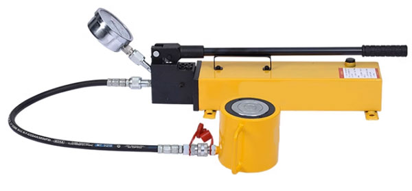 5、使用時(shí)先將手動(dòng)泵的快速接頭與頂對接,然后選好位置,將油泵上的放油螺釘旋緊,即可工作。將放油螺釘旋松,油缸卸荷。